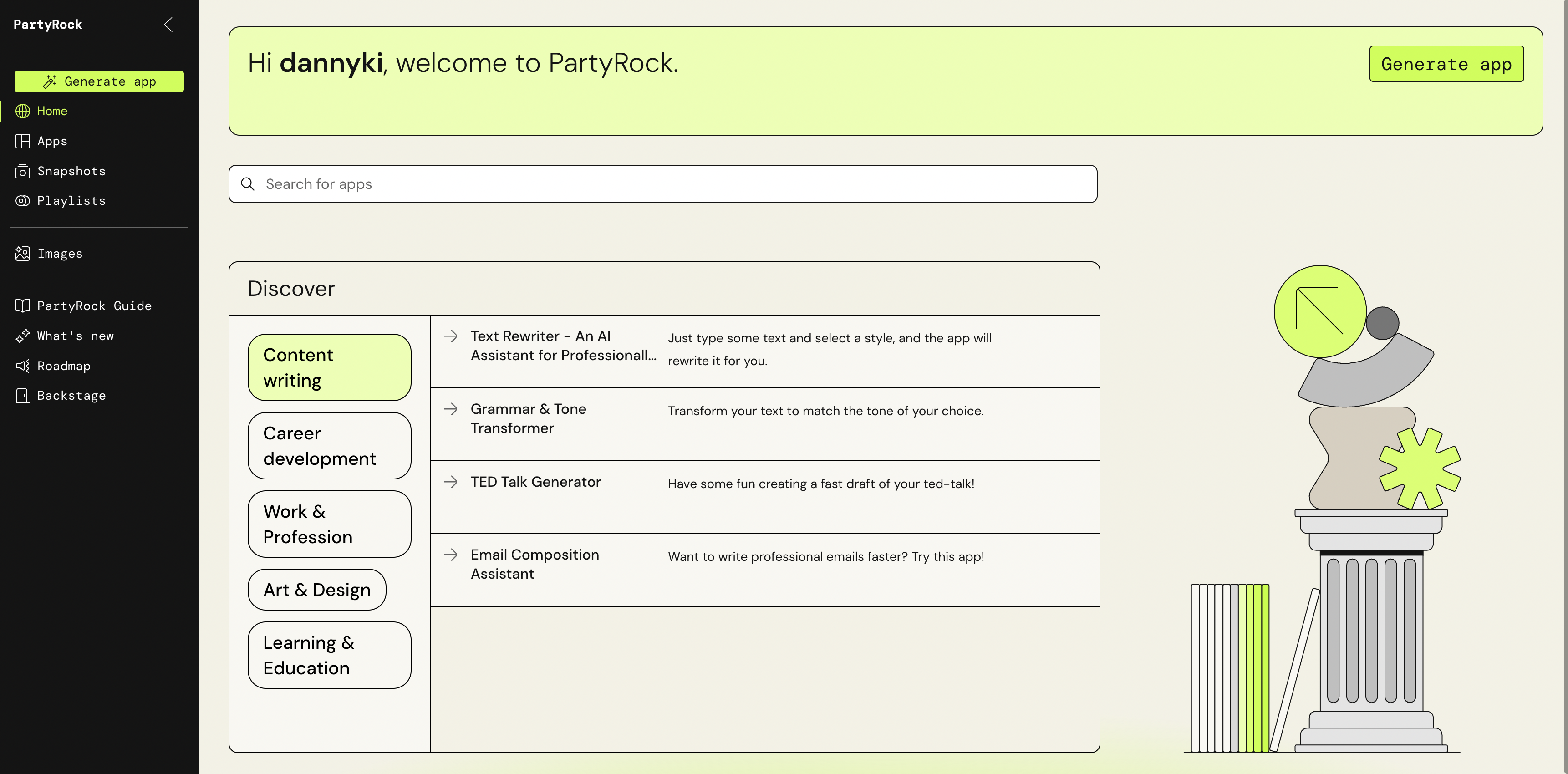 - PartyRock은 AWS에서 제공하는 생성형 AI 앱 제작 실습 공간(Playground) 입니다.