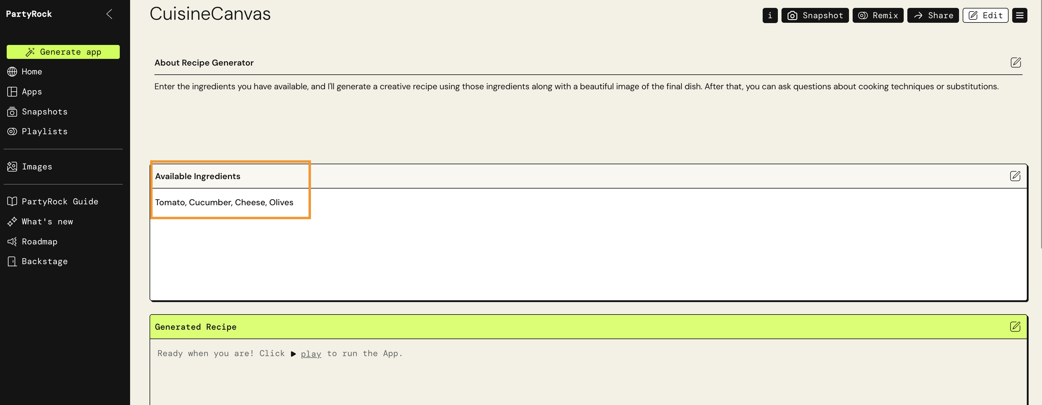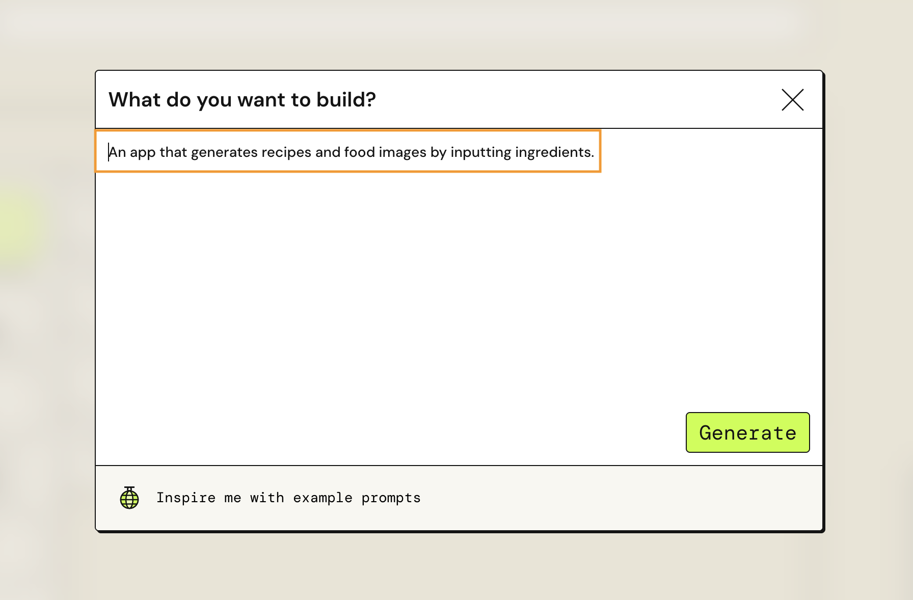- 예: “재료를 입력하면 레시피와 음식 이미지를 생성하는 앱”
