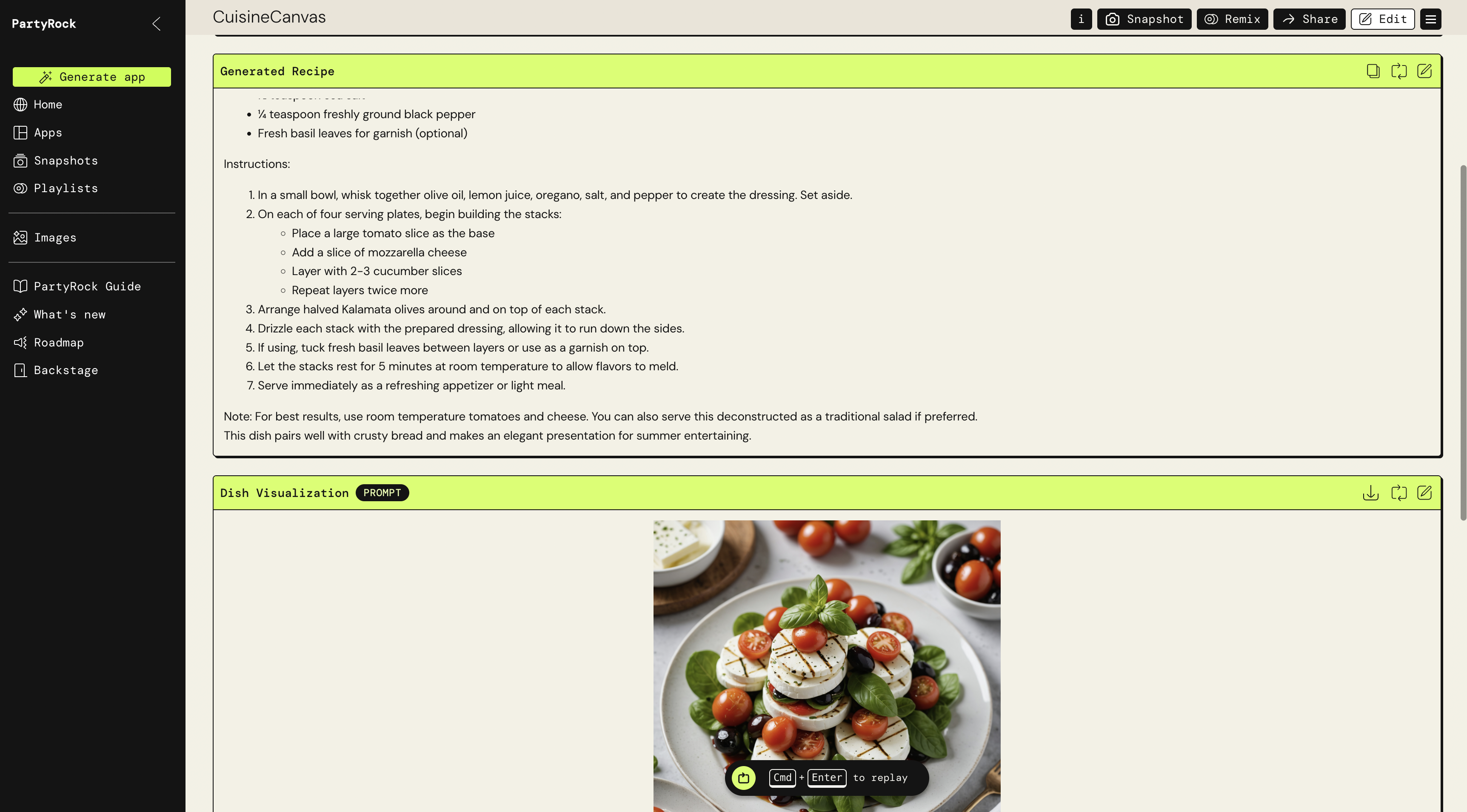 - “Tomato, Cucumber, Cheese, Olives” → 레시피와 음식 이미지 자동 생성