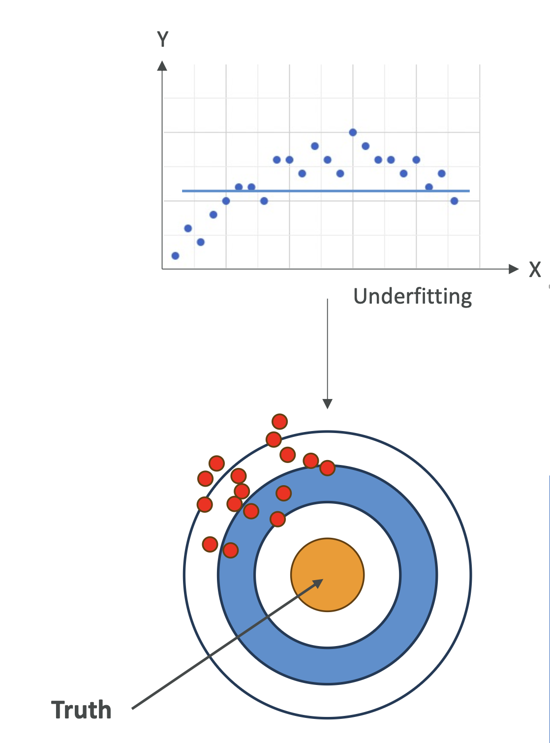 - Underfitting → 훈련 데이터조차 성능 나쁨 → Bias ↑