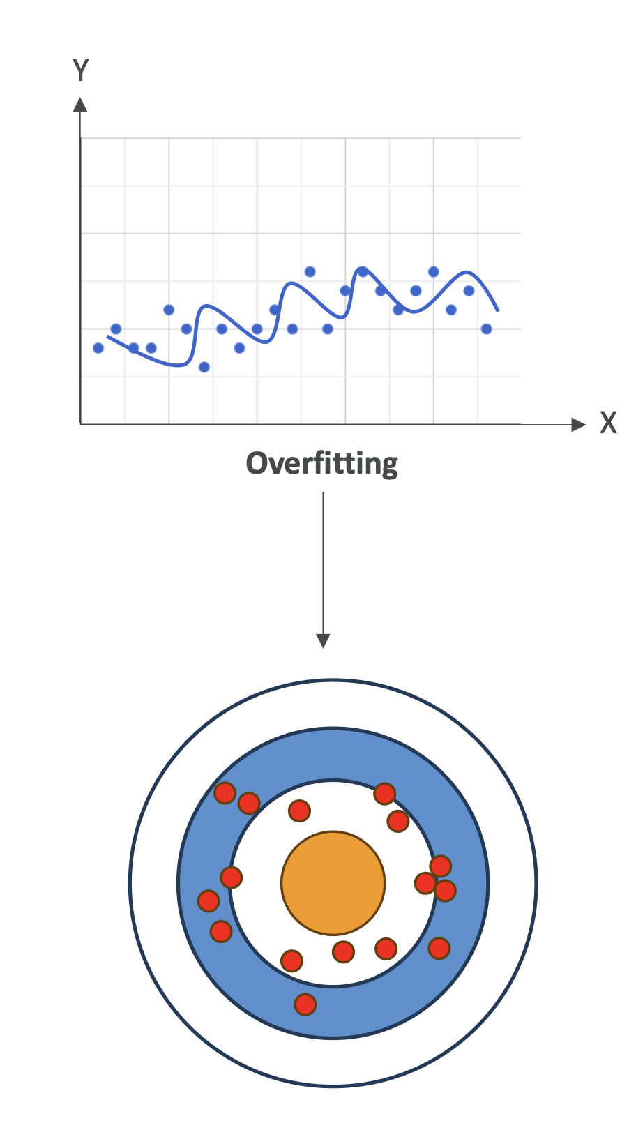 | Low Bias + High Variance | 중심 근처에 맞추지만 흩어져 있음 | Overfitting |