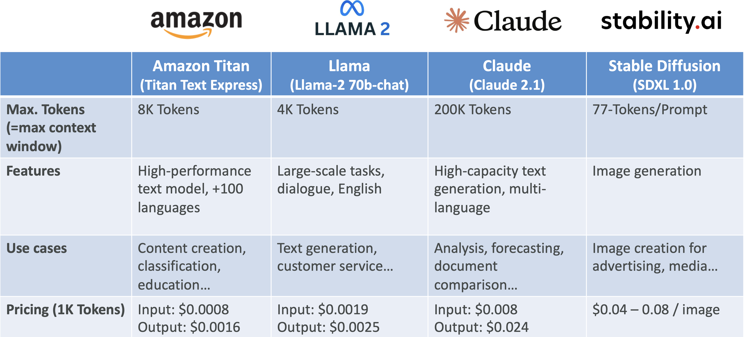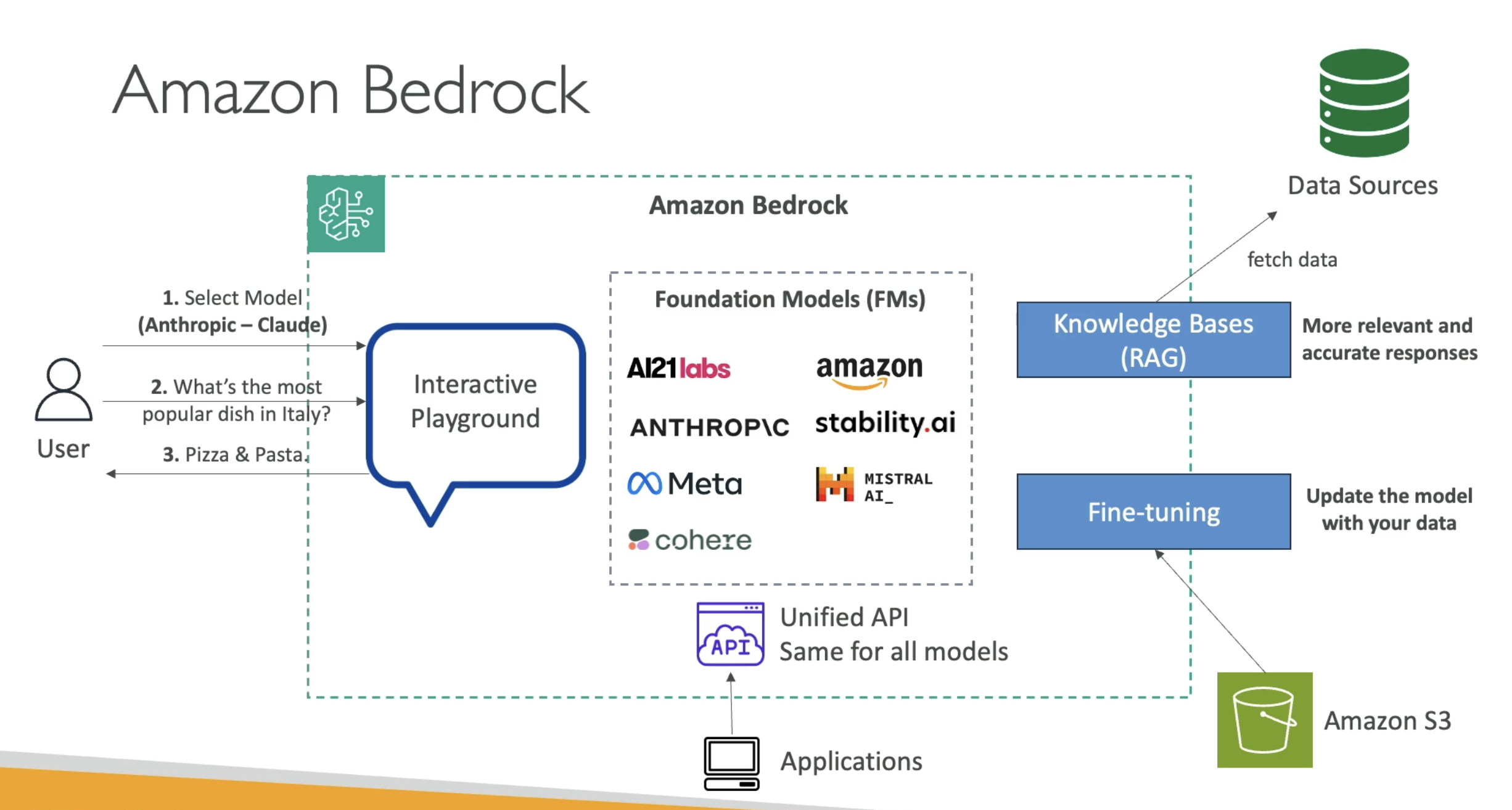 | Bedrock 특징 | 완전 관리형, 서버리스, 여러 FM을 API로 통합 제공 |