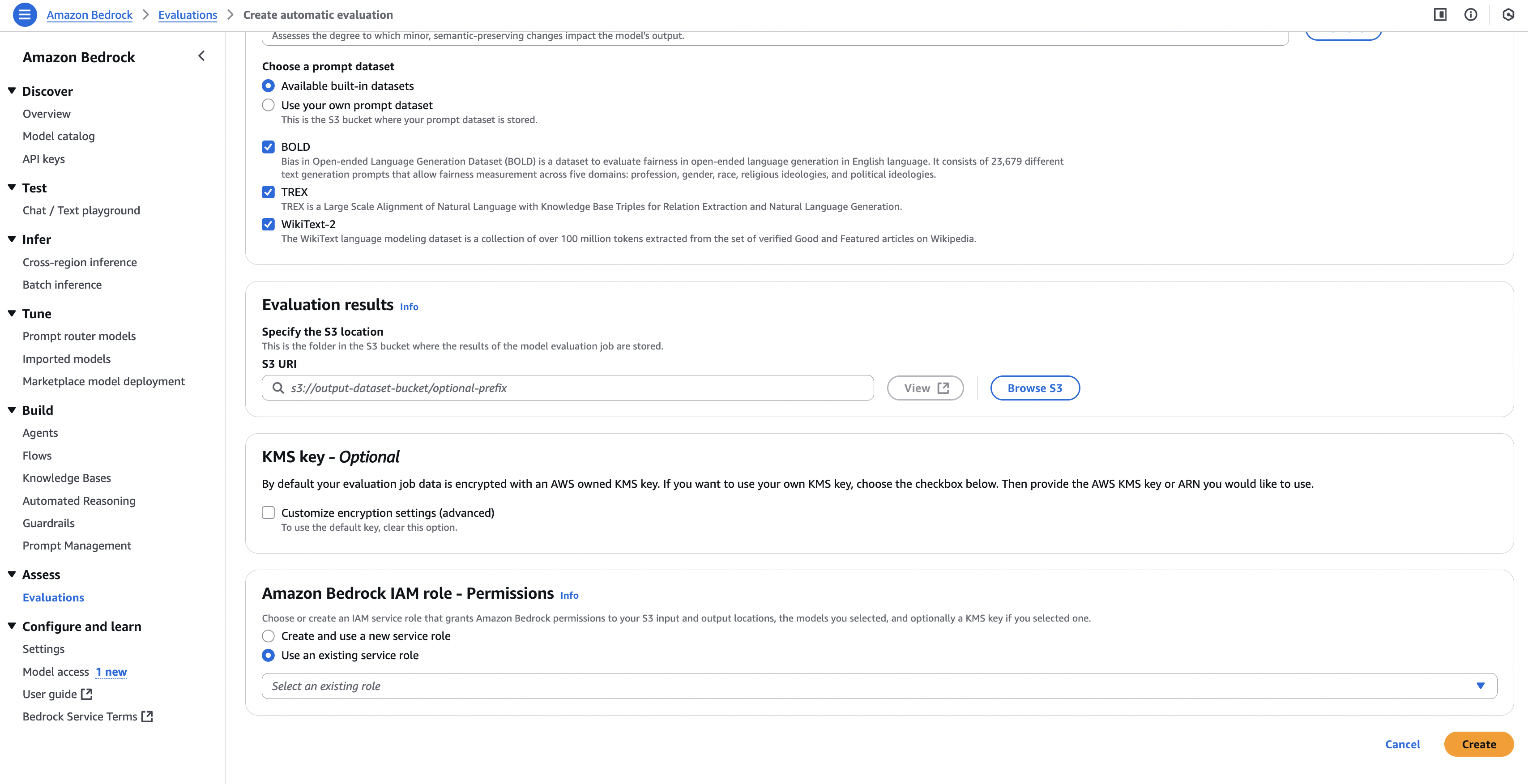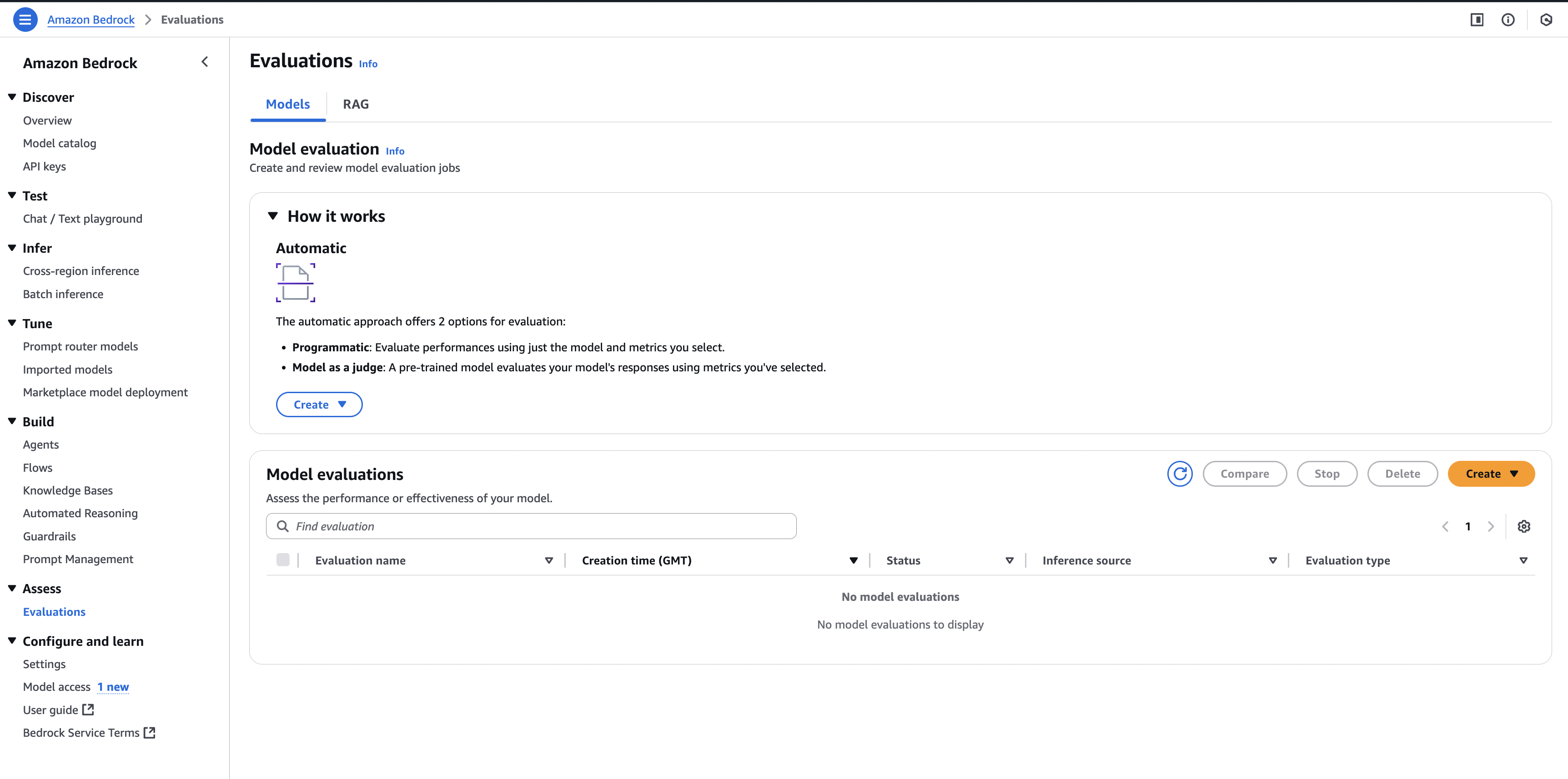 - Bedrock에서 평가(Evaluation) 기능은 콘솔 메뉴에 있음