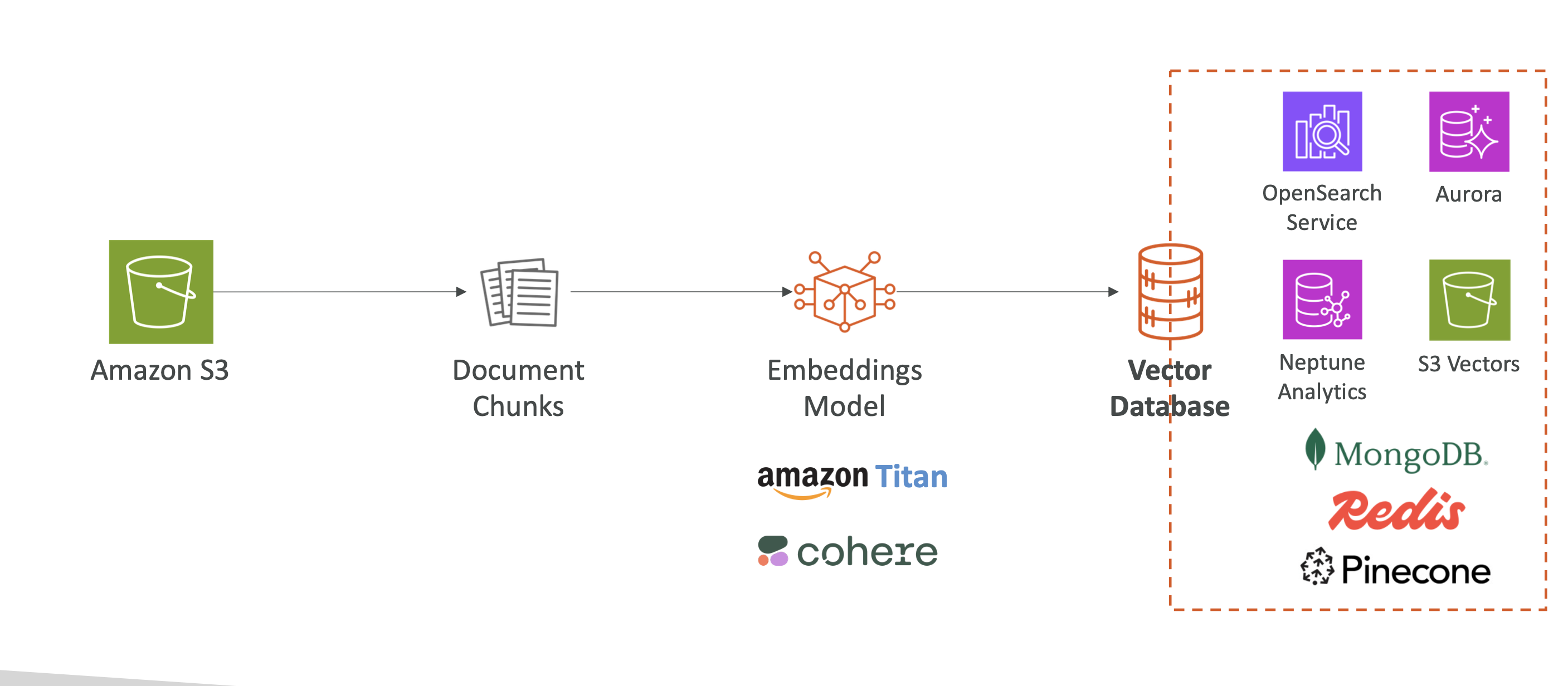- 변환된 벡터를 OpenSearch, Aurora, Neptune, S3 Vectors 같은 벡터 DB에 저장