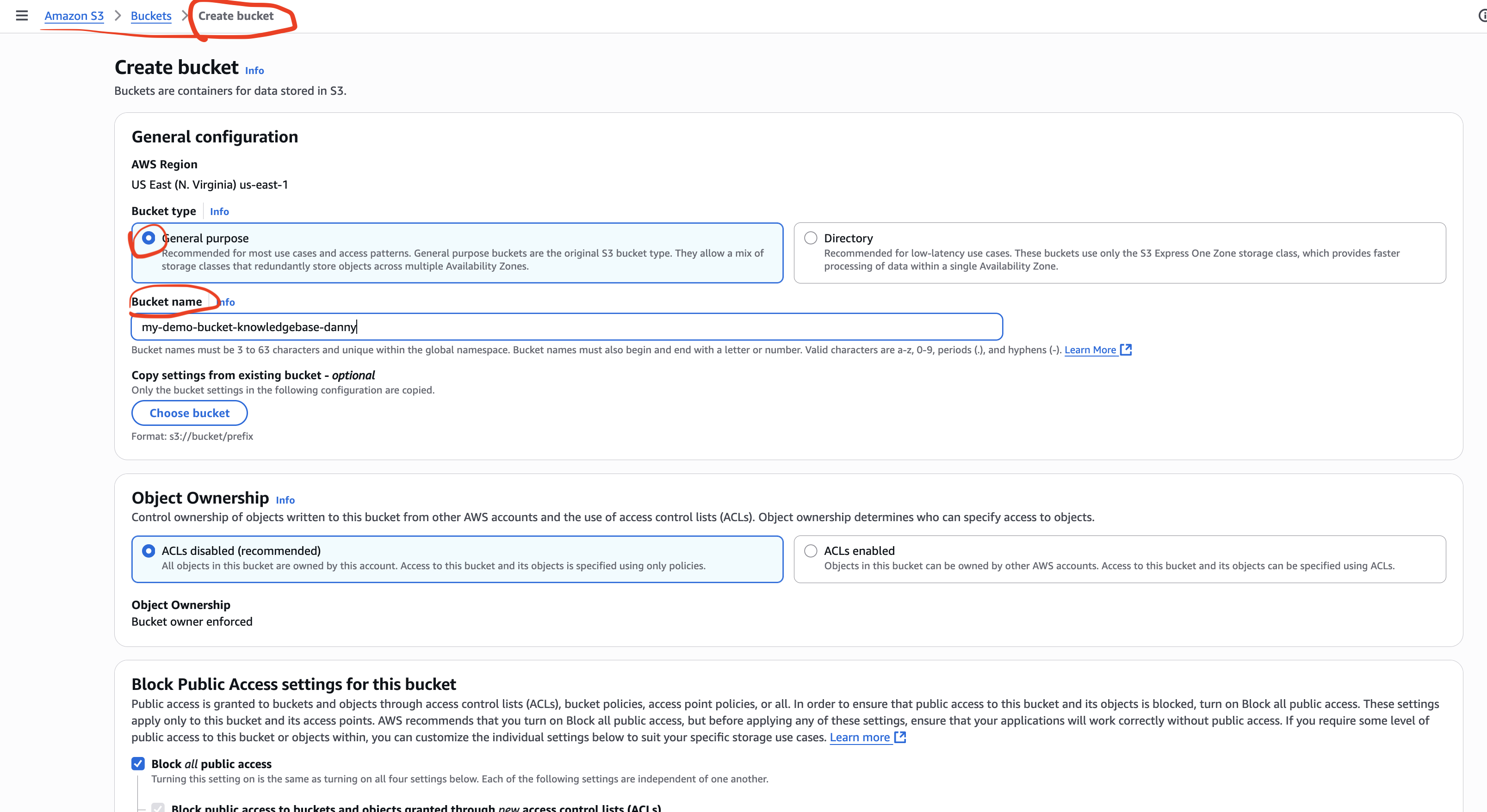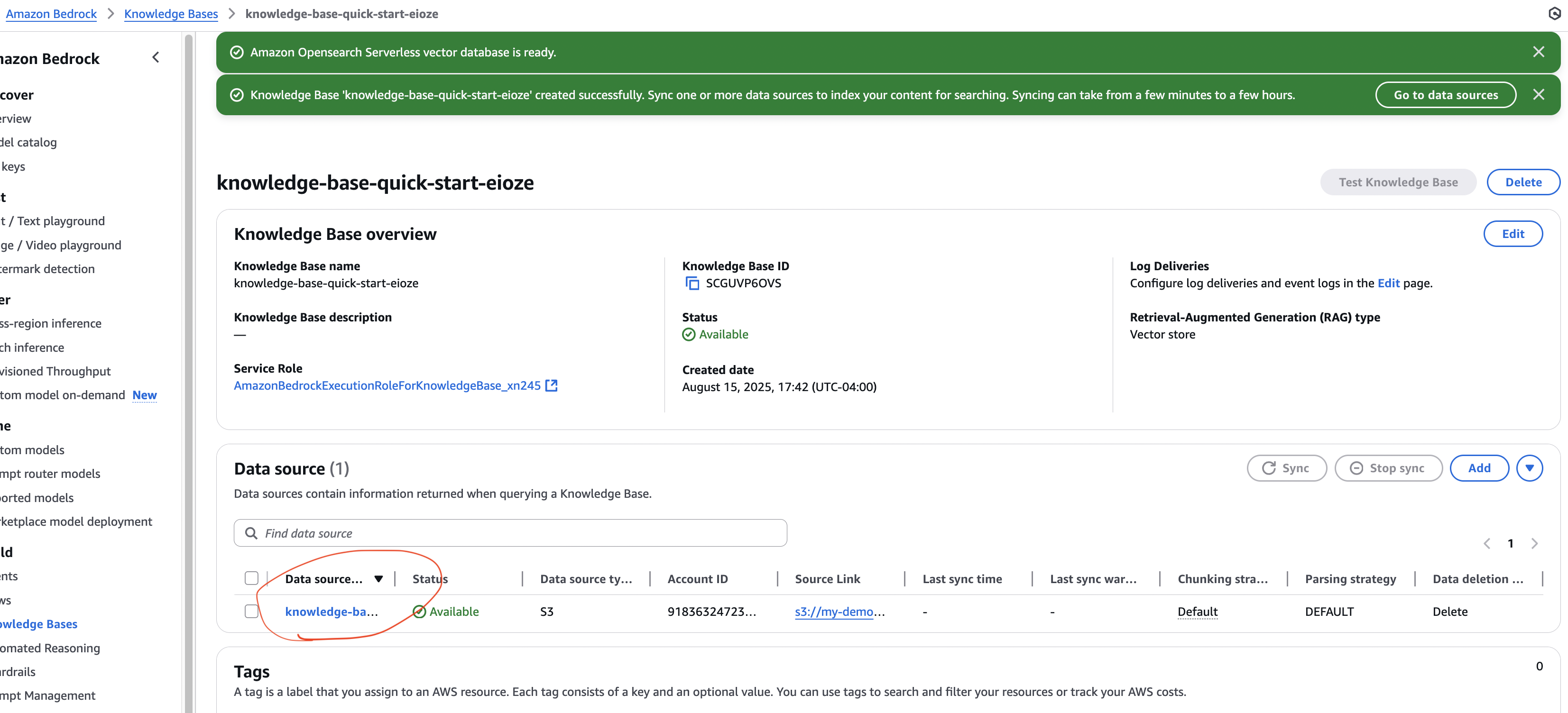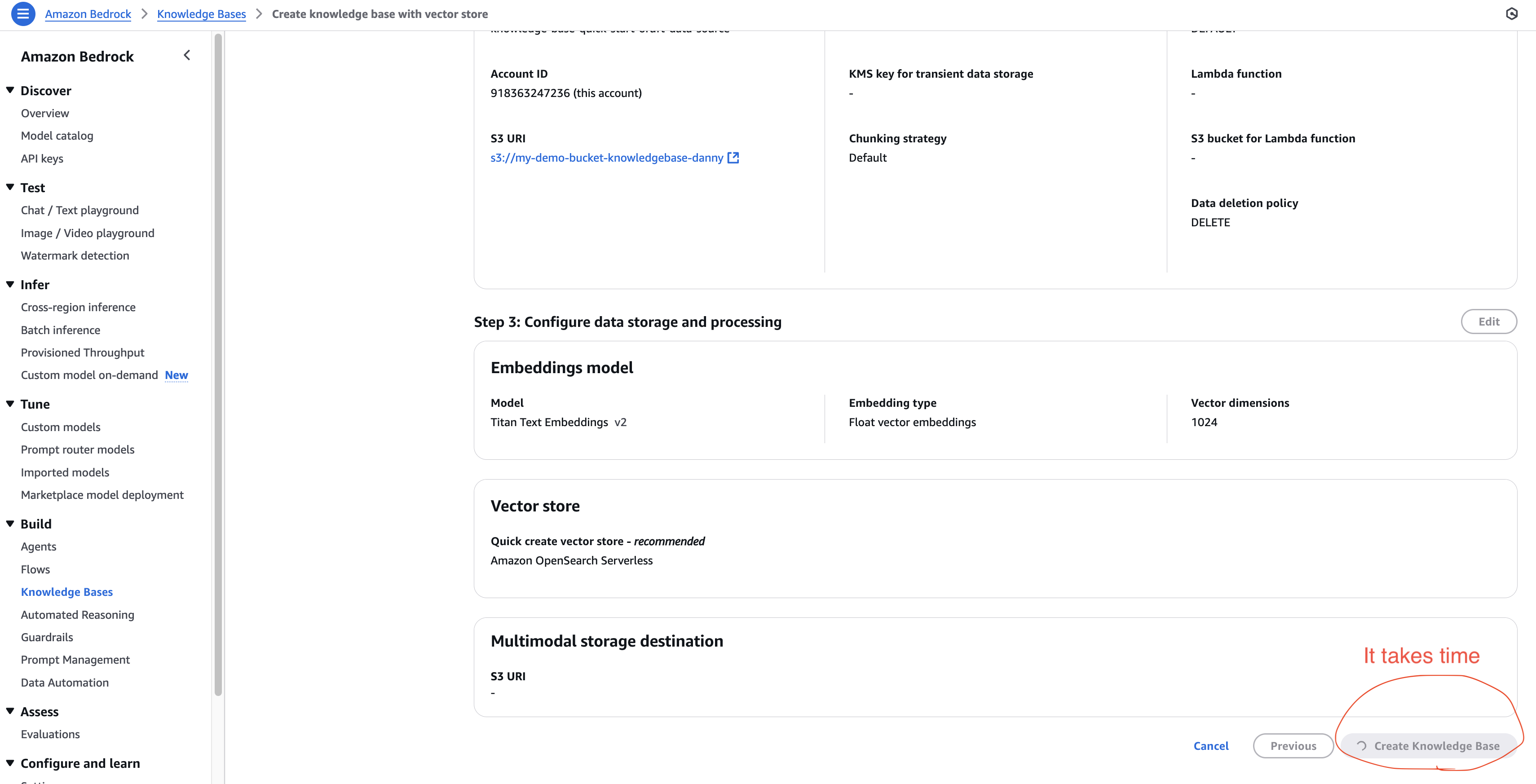 - Bedrock 콘솔 → Knowledge Bases → Create