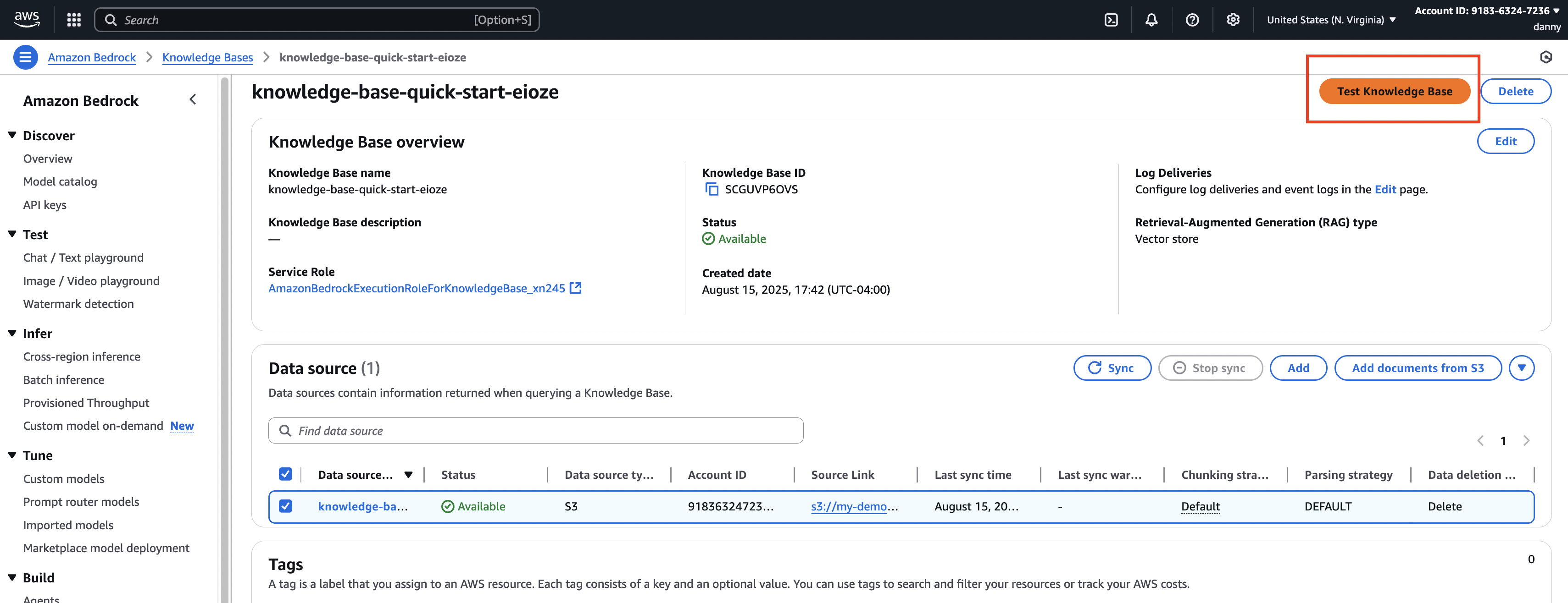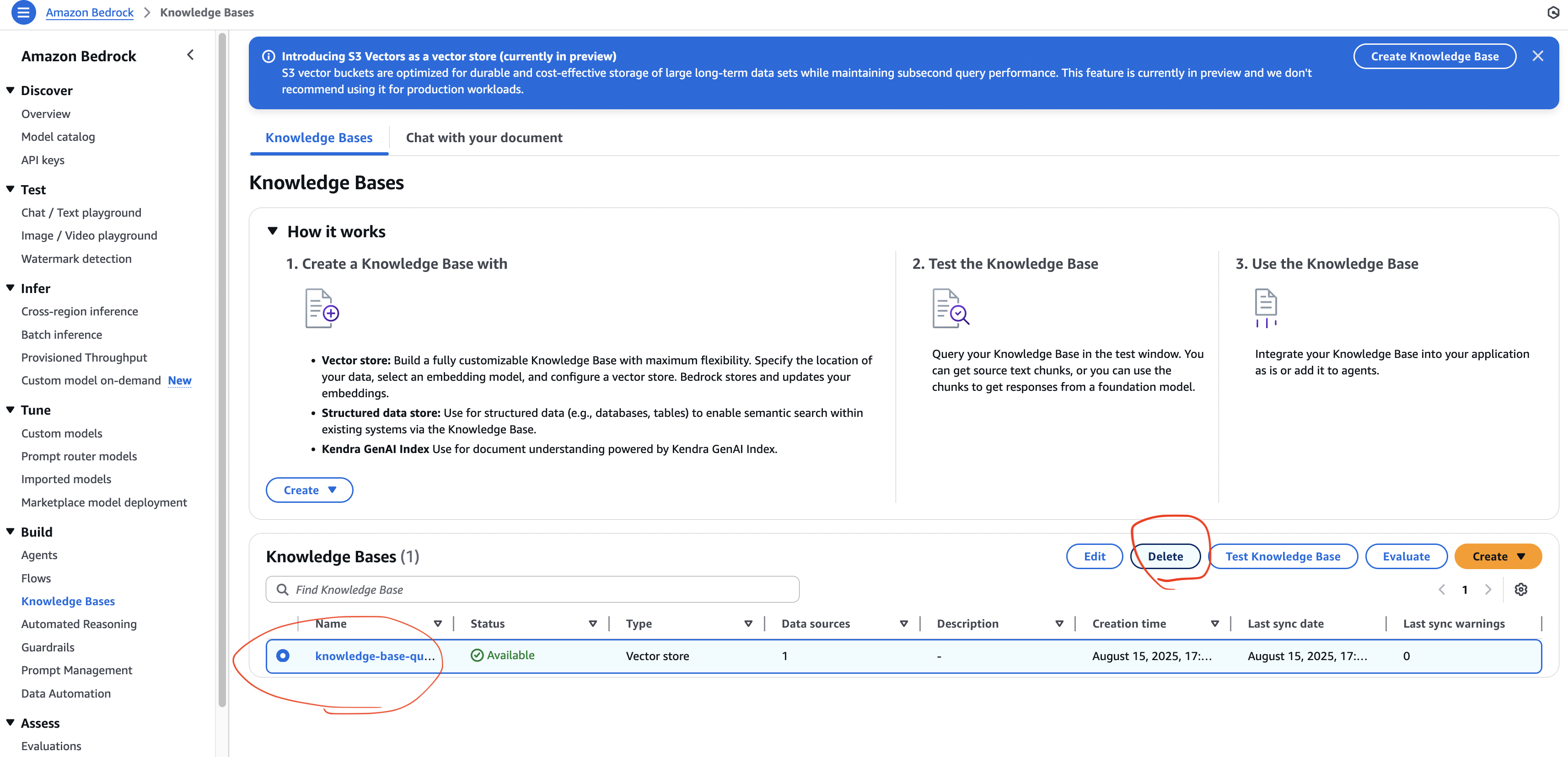 테스트 끝난 후: 1. Bedrock 지식 베이스 삭제 2. OpenSearch Serverless 컬렉션 삭제 3. (선택) S3 버킷 유지 또는 삭제 (S3는 저렴)