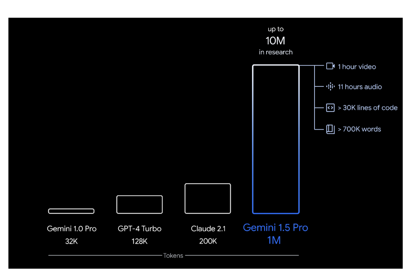 - 100만 토큰 ≈ 책 3~4권, 코드 3만 줄, 오디오 11시간 분량