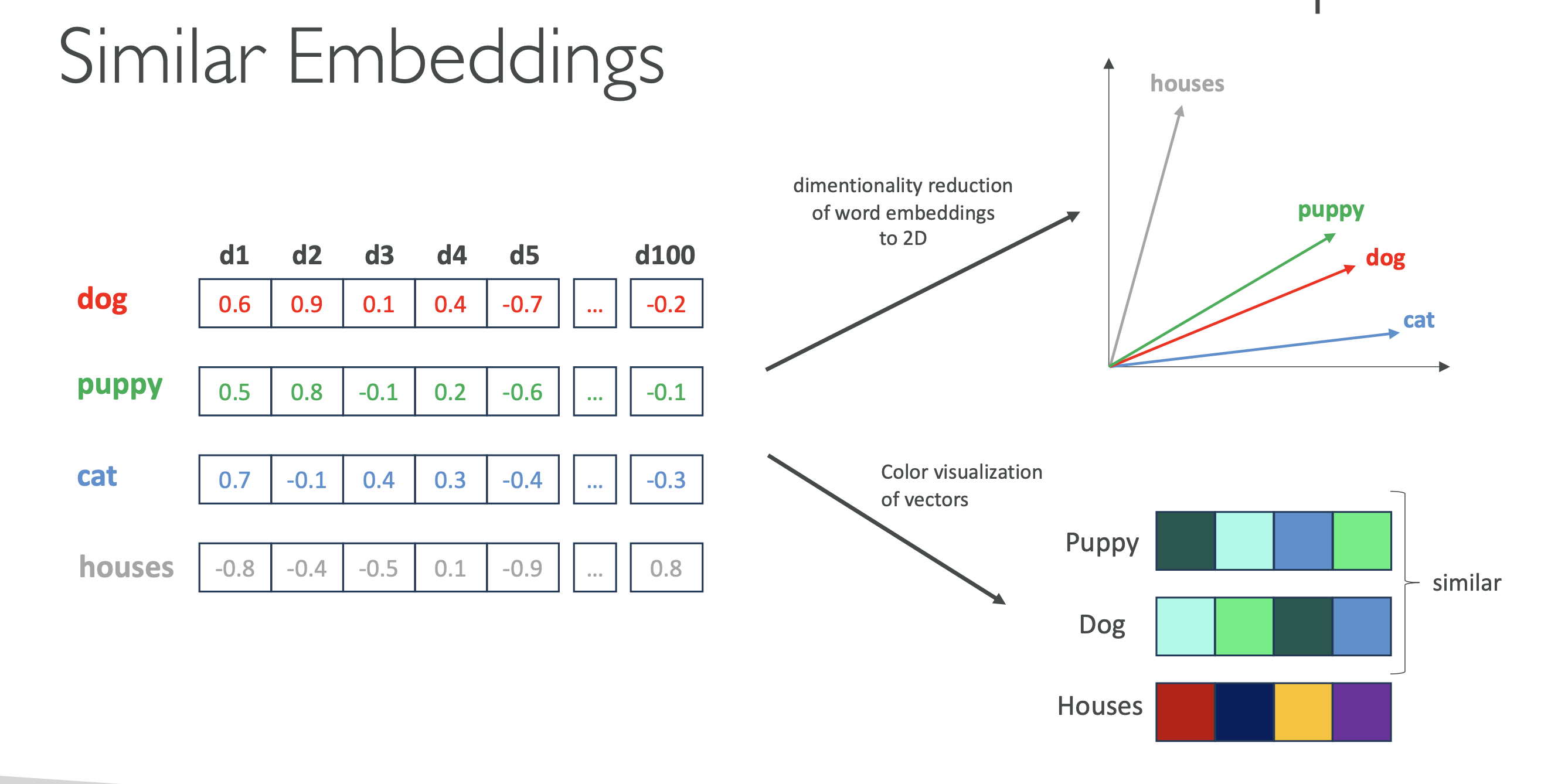 "dog"↔"puppy"→ 가까움"dog"↔"cat"→ 비슷한 범주"dog"↔"house"→ 멀리 떨어짐